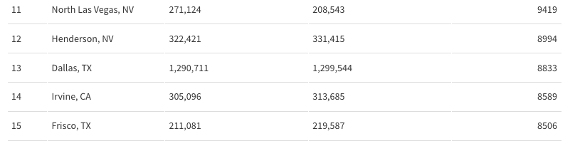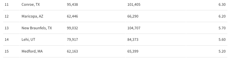 Including the growth in Texas, nine of the 15 fastest-growing cities were located in the southern portion of the U.S.