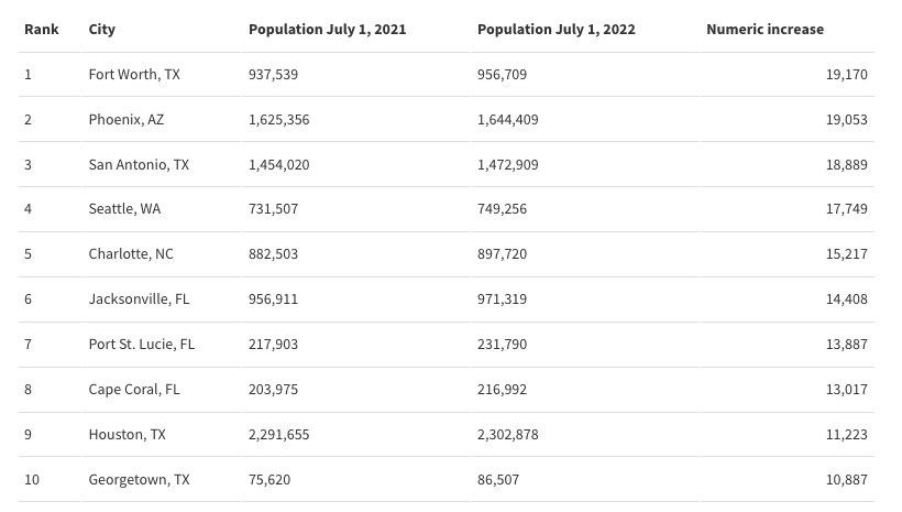 - Fort Worth topped that list adding 19,170 people from July 1, 2021 to July 1, 2022, according to the estimates.