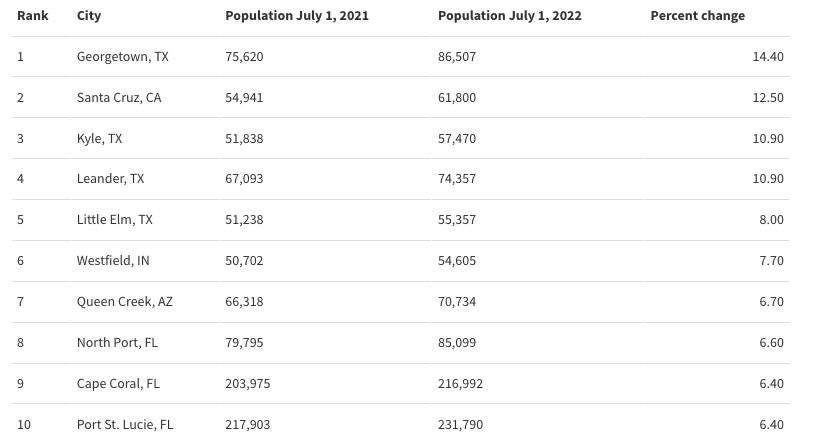 - “Georgetown, Texas, remained the fastest-growing city by percent change in 2022, with the highest rate of growth among all U.S. cities and towns with at least 50,000 people. It wasn’t the only city to retain its distinction over the year, however,” said Crystal Delbé, a statistician in the U.S. Census Bureau’s Population Division, in the May 18 news release. “New York remained the nation’s largest city, despite its recent population decline. At 8.3 million, its population was more than twice that of the next largest city, Los Angeles, with a population of nearly 4 million.”