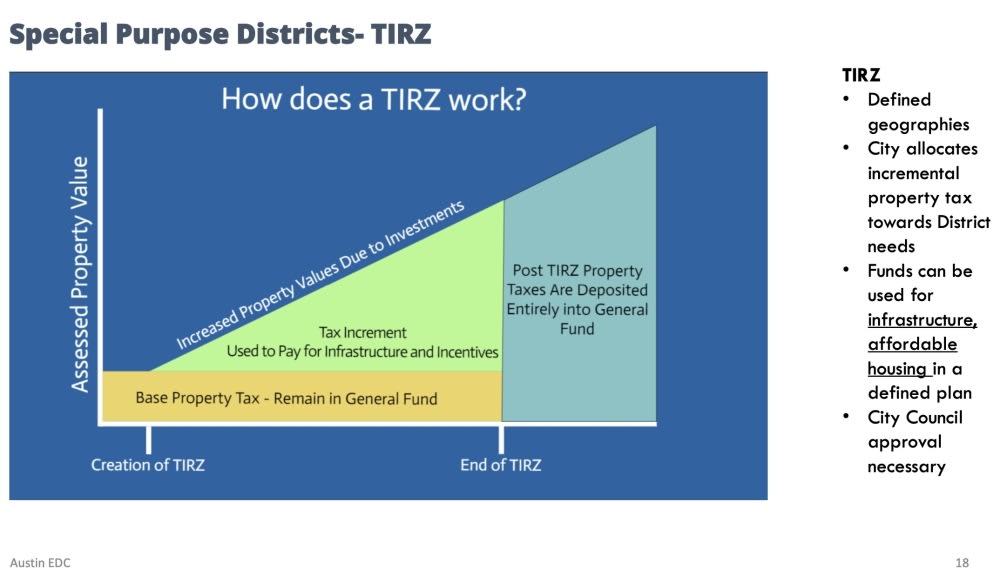 A TIRZ is used to reserve a portion of property tax collections within “blighted” or underdeveloped area for civic needs; a new road grid and streetscapes, drainage infrastructure, parkland and affordable housing are all possibilities. Former Mayor Steve Adler said while the district is primed for new development, the funding system is needed to ensure the South Central Waterfront builds out as desired.